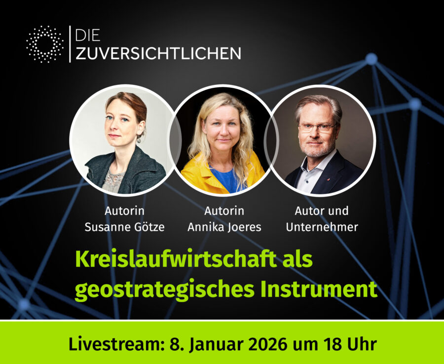 Europa bleibt trotz Aufrüstung verwundbar, solange wir von Öl, Gas und Rohstoffen autoritärer Staaten abhängig sind. In der nächsten Ausgabe der Zuversichtlichen zeigen Reinhard Schneider, SPIEGEL-Autorin Dr. Susanne Götze und CORRECTIV- und ZEIT Journalistin Annika Joeres, wie Kreislaufwirtschaft eine Antwort auf geopolitische Risiken gibt und echte Resilienz schafft – als entscheidender Sicherheitsfaktor für unsere Zukunft. Ein Aspekt, den die deutsche und europäische Politik bisher zu wenig beachtet. Unabhängigkeit und echte Nachhaltigkeit gehören zusammen – starten wir in das Jahr 2026 mit Zuversicht!