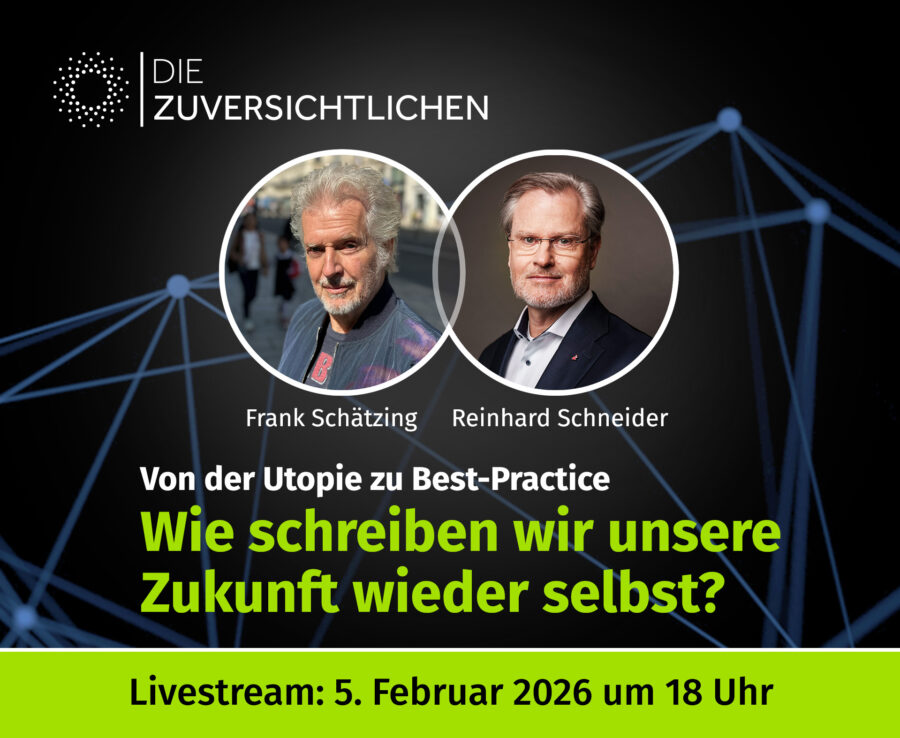 Im Talk der Zuversichtlichen zeigen Frank Schätzing und Reinhard Schneider, wie wir uns aus der Starre lösen und auf Europas Stärken fokussieren. Mit inspirierenden Best-Practice-Beispielen machen sie deutlich: Die Lösungen für die drängenden Fragen unserer Zeit sind da – wenn Politik und Wirtschaft gemeinsam Hürden abbauen und in Zukunftstechnologien investieren.